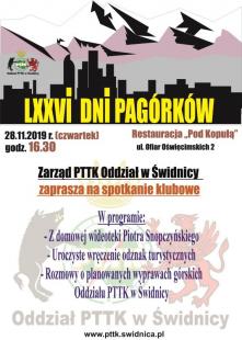 Serdecznie zapraszamy na kolejne, LXXVI DNI PAGÓRKÓW w dniu 28.11.2019 (czwartek) o godz. 16.30 w Restauracji "Pod Kopułą" ul. Ofiar Oświęcimskich 2