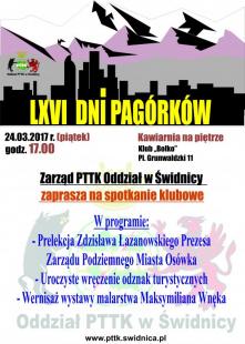 W imieniu aktywu Polskiego Towarzystwa Turystyczno - Krajoznawczego w Świdnicy serdecznie dziękuję za wygłoszoną prelekcję na temat Podziemnego Miasta Osówka przez P. Zdzisław Łazanowskiego Prezesa Zarządu Podziemnego Miasta Osówka w ramach Dni Pagórków w dniu 24.03.2017 r. o godz. 17.00 w Klubie "Bolko", pl. Grunwaldzki 11, Świdnica.