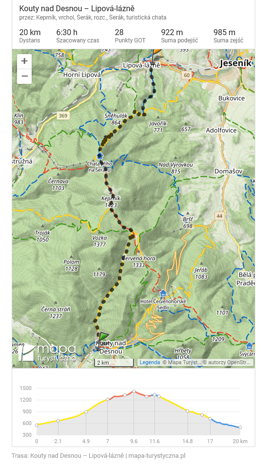 Kouty nad Desnou - Poniklý potok - Sedlo pod Vřesovkou - Keprník, vrchol (Sudecki Włóczykij) - Šerák, turistická chata - Lipová-lázně