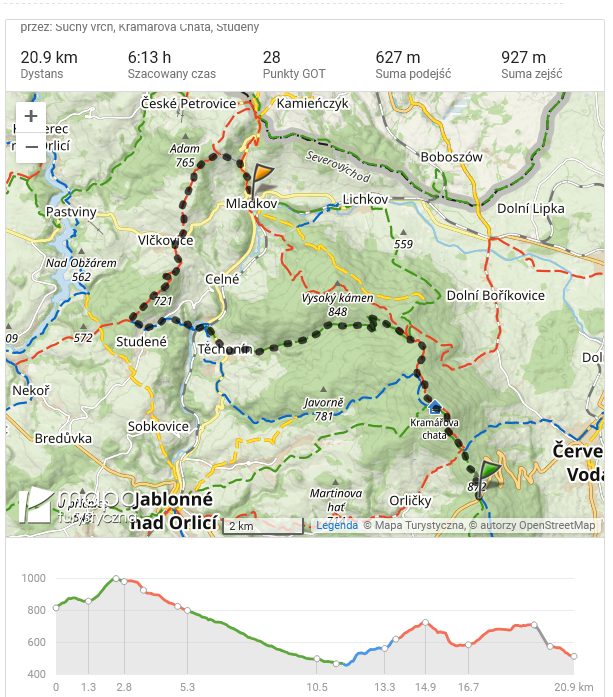 Červenovodské sedlo - Suchý vrch (Włóczykij) - Kramářova Chata - Tvrz Bouda - Těchonín - Studenský horní les - Studený (Włóczykij) - Mladkov