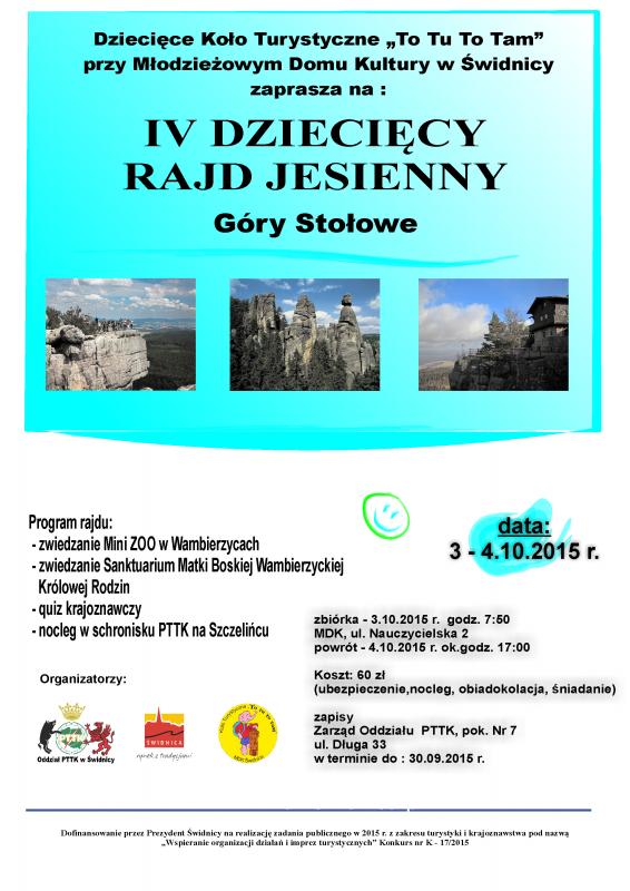 3 października 2015 roku z inicjatywy Polskiego Towarzystwa Turystyczno Krajoznawczego w Świdnicy na 2-dniową wycieczkę wyjechała 31-osobowa grupa dzieci wraz z 3 opiekunami i 6 rodzicami. Uczestnikami wyprawy byli podopieczni koła „ToTuToTam” działającego przy Młodzieżowym Domu Kultury w Świdnicy oraz Grupa Włóczykije ze Szkoły Podstawowej nr 6 w Świdnicy. Wycieczka adresowana została do uczniów szkół podstawowych, ale najmłodsza uczestniczka miała zaledwie 5 lat, w trasę wyruszyła z mamą. Był to już IV Dziecięcy Rajd Jesienny.