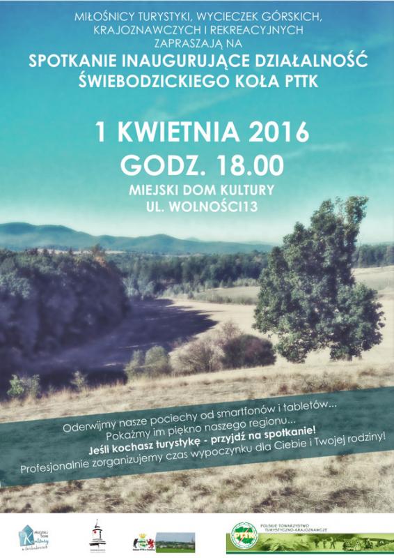 Miłośnicy turystyki, wycieczek górskich krajoznawczych i rekreacyjnych zapraszają na SPOTKANIE INAUGURACYJNE DZIAŁALNOŚĆ ŚWIEBODZICKIEGO KOŁA PTTK 1 kwietnia 2016 r. o godz. 18.00 w Miejskim Domu Kultury, ul. Wolności 13.