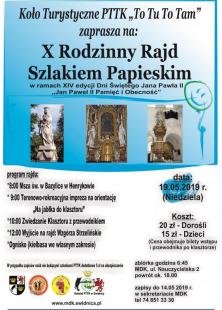 Oddziałowa Komisja Turystyki Pieszej i Krajoznawczej oraz Młodzieżowe Koło ToTuToTam przy MDK zapraszają na X Rodzinny Rajd Szlakiem Papieskim.