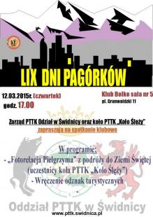 Zarząd Oddziału PTTK w Świdnicy informuje, że 12.03.2015 w sali nr 5 Klubu "Bolko" Pl. Grunwaldzki 11 godz.17.00 odbyły się LIX DNI PAGÓRKÓW