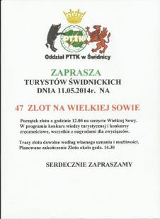 W niedzielę 11 maja odbył się 47 Zlot Turystów Świdnickich na Wielkiej Sowie.W zlocie wzięło udział ok stu najwytrwalszych turystów, których nie wystraszyła niepewna pogoda, a jak sie okazało była całkiem przyzwoita, trochę wiało i padało, a także świeciło słoneczko.